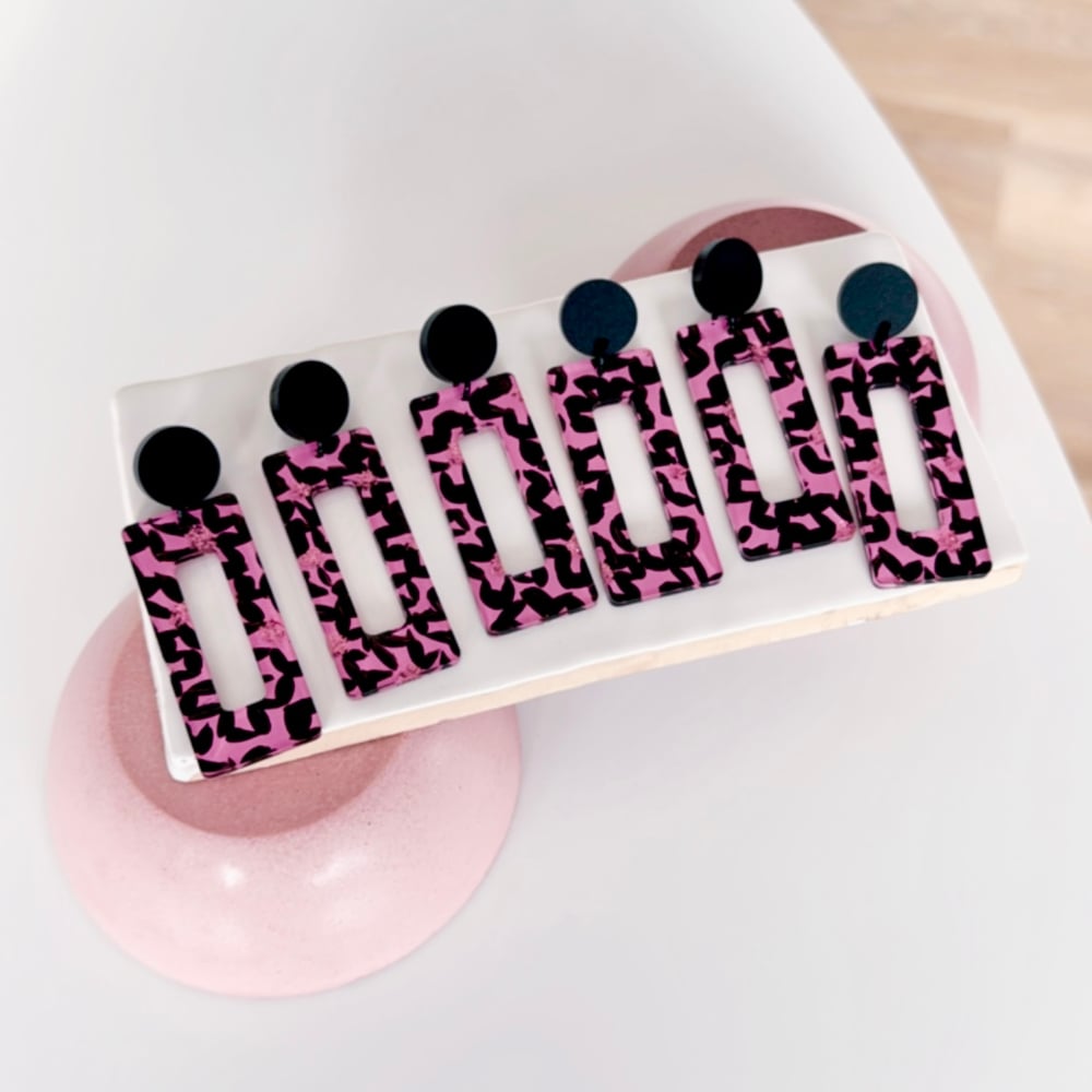 These dangles are the ultimate dangles that can be dressed right up or down. Made with a matte black top and painted bottom piece, finished with pops of pink glitter.